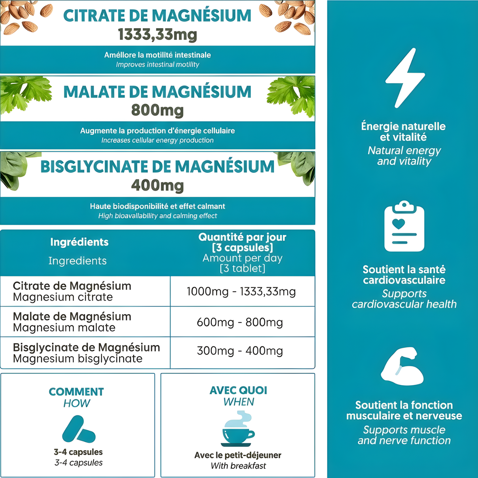 Notre formule de magnésium triple dose aide votre corps à retrouver ce qu'il lui manque : énergie, sommeil réparateur et clarté mentale — pour que vous vous sentiez enfin mieux.